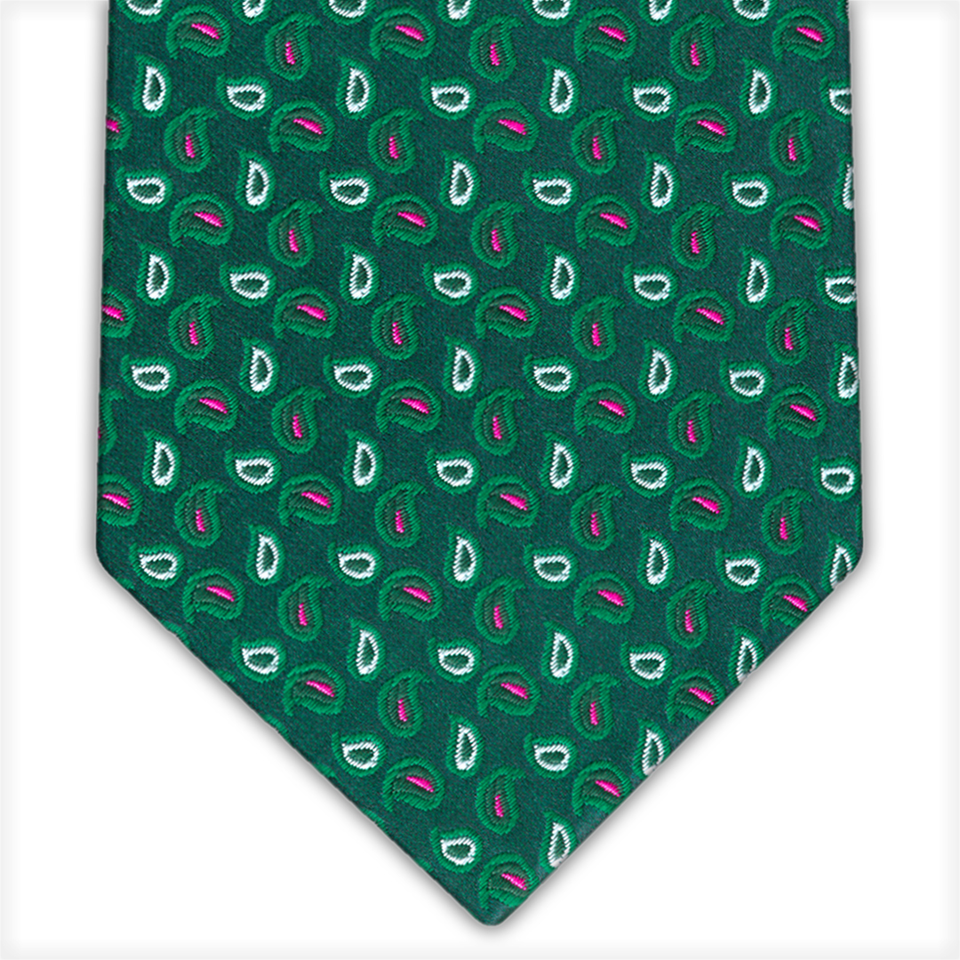 Juvenil y llamativa corbata confeccionada en color verde con pequeñas amebas cachemir. Aporta un toque alegre, personal y desenfadado que llama siempre la atención del que lo luce. Combina fácilmente con cualquier camisa y traje. Podrás disfrutar de esta preciosa corbata durante años, ¡Una interesante adquisición para tu colección de corbatas!