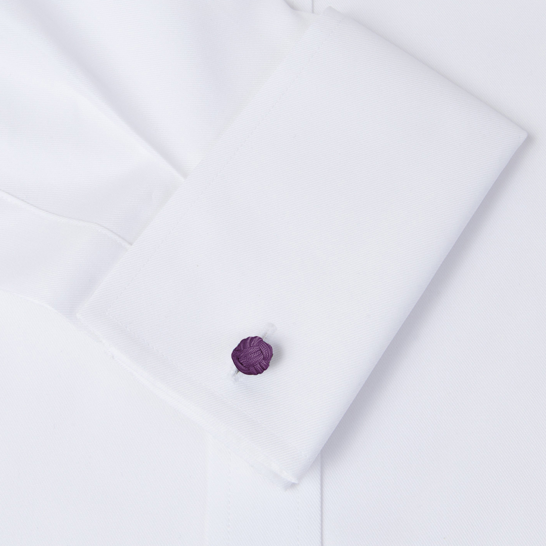Gemelos realizados en pasamanería de seda elástica -también conocidos como gemelos de nudos- con forma redonda de bola en color berenjena. Perfectos para combinar con tu corbata o pajarita, los gemelos de pasamanería dan una nota alegre y de color a los puños de tu camisa. Es una opción cómoda, fáciles de poner gracias a su tejido elástico y muy económicos. Son perfectos para su uso a diario, por su aspecto desenfadado y alegre quedan perfectos para una vestimenta menos formal o de sport.