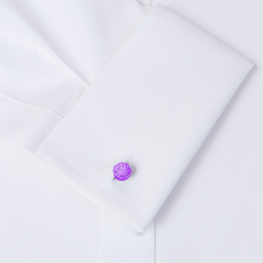 Gemelos realizados en pasamanería de seda elástica -también conocidos como gemelos de nudos- con forma redonda de bola en color malva. Perfectos para combinar con tu corbata o pajarita, los gemelos de pasamanería dan una nota alegre y de color a los puños de tu camisa. Es una opción cómoda, fáciles de poner gracias a su tejido elástico y muy económicos. Son perfectos para su uso a diario, por su aspecto desenfadado y alegre quedan perfectos para una vestimenta menos formal o de sport.
