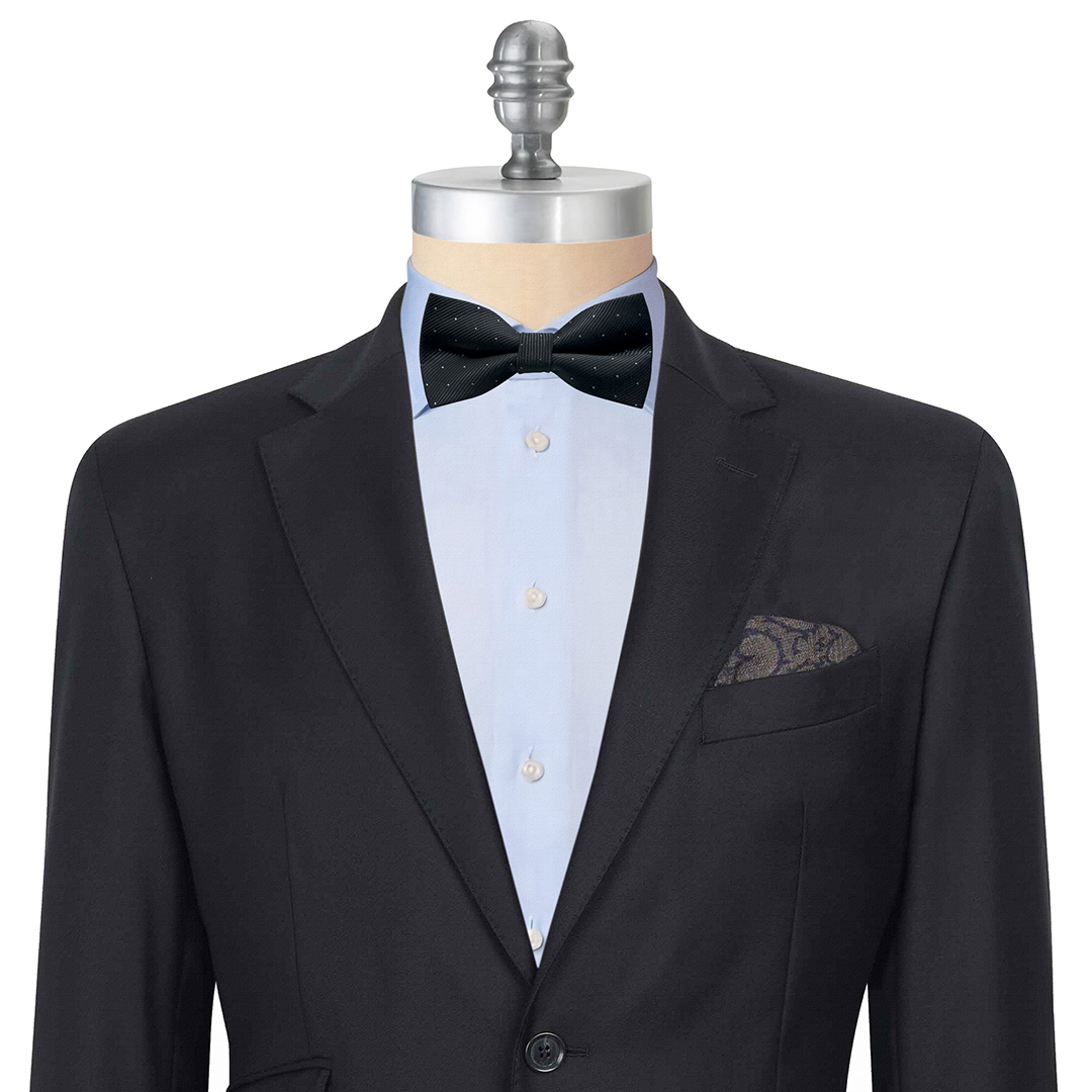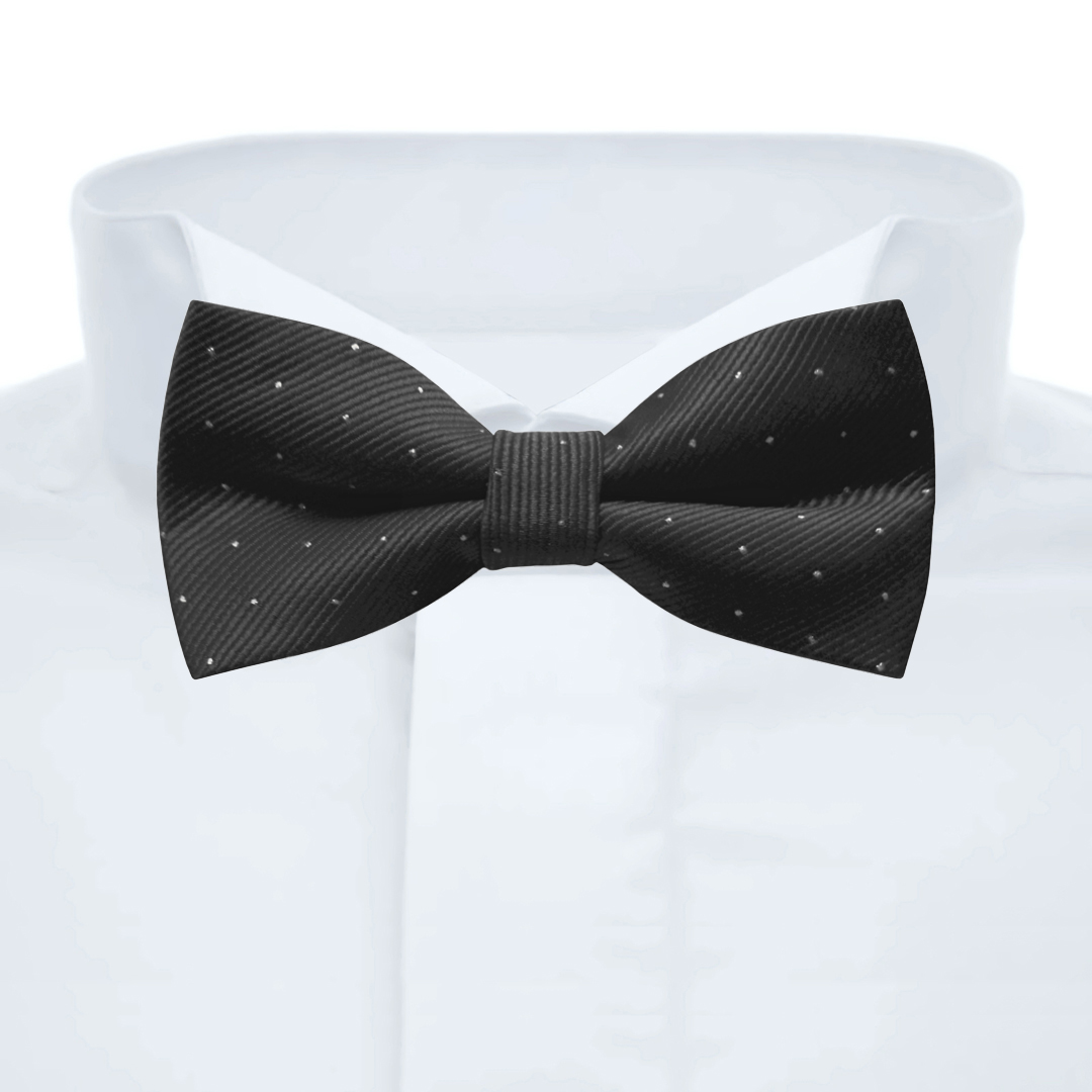 Clásica pajarita en color negra con discretos microtopos -pequeños puntitos- en hilo de plata, tejido con brocado diagonal y acabado con un pliegue. Su color liso hace a esta pajarita perfecta para combinar con todo tipo de camisas: lisas, de cuadros o estampadas. El remate determinante para completar una imagen impecable.
